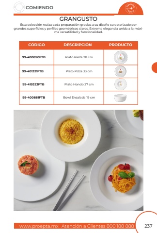 www.proepta.mxAtenci%u00f3n a Clientes 800 188 888COMIENDO237GRANGUSTOEsta colecci%u00f3n realza cada preparaci%u00f3n gracias a su dise%u00f1o caracterizado por grandes superficies y perfiles geom%u00e9tricos claros. Extrema elegancia unida a la m%u00e1xima versatilidad y funcionalidad.Plato Pizza 33 cmPlato Pasta 28 cmPlato Hondo 27 cmBowl Ensalada 19 cm99-401321FTB99-400850FTB99-419323FTB99-400881FTBC%u00d3DIGODESCRIPCI%u00d3NPRODUCTO