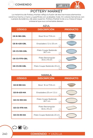 COMIENDOVAJILLACOMIENDO240POTTERY MARKETLa melamina de Pottery Market refleja la fusi%u00f3n de dos hermosos elementos:cer%u00e1mica hecha a mano y superficies con acabados mate. En colores llamativos con cuerpos duraderos y de peso superior, Pottery Market le da a su mesa el toqueartesanal que sus comensales desean.AZULMANILABowl 16 oz 17.8 cmEnsaladera 1.2 Lt 25 cmPlato Coupe Redondo 26.7 cmPlato Rectangular30.5 x 19 cmPlato Coupe Redondo 23 cmGE-B-180-GBLGE-B-420-GBLGE-CS-100-GBLGE-CS-1170-GBLGE-CS-90-GBLC%u00d3DIGODESCRIPCI%u00d3NPRODUCTOBowl 16 oz 17.8 cmEnsaladera 25 cm 1.2 LtPlato Coupe Redondo 26.7 cmPlato Rectangular30.5 x 19 cmPlato Coupe Redondo 23 cmGE-B-180-MAGE-B-420-MAGE-CS-100-MAGE-CS-1170-MAGE-CS-90-MAC%u00d3DIGODESCRIPCI%u00d3NPRODUCTOMELAMINA