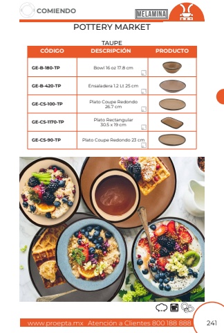 www.proepta.mxAtenci%u00f3n a Clientes 800 188 888COMIENDO241POTTERY MARKETTAUPEBowl 16 oz 17.8 cmEnsaladera 1.2 Lt 25 cmPlato Coupe Redondo 26.7 cmPlato Rectangular30.5 x 19 cmPlato Coupe Redondo 23 cmGE-B-180-TPGE-B-420-TPGE-CS-100-TPGE-CS-1170-TPGE-CS-90-TPC%u00d3DIGODESCRIPCI%u00d3NPRODUCTOMELAMINA
