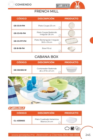 www.proepta.mxAtenci%u00f3n a Clientes 800 188 888COMIENDO245MELAMINAFRENCH MILLCABANA BOXPlato Coupe Redondo Irregular 26 cmPlato Rectangular Irregular30.5 x 19 cmPlato Coupe 23 cmGE-CS-10-FMGE-CS-117-FMGE-CS-9-FMC%u00d3DIGODESCRIPCI%u00d3NPRODUCTOContenedor Redondo26 x 27.9 x 21 cmPlato Cuadrado MelaminaBlanco 24 cmGE-CB-935-WCL-4330602C%u00d3DIGOC%u00d3DIGODESCRIPCI%u00d3NDESCRIPCI%u00d3NPRODUCTOPRODUCTOGE-B-18-FMBowl 16 oz