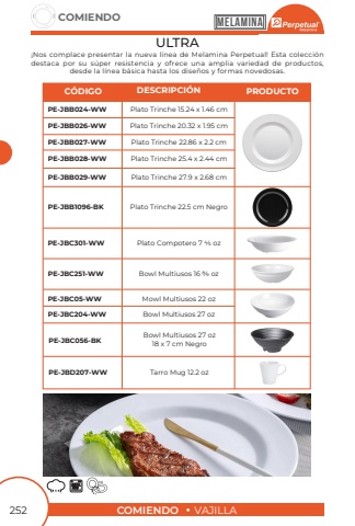 COMIENDOVAJILLACOMIENDO252Plato Trinche 15.24 x 1.46 cmPlato Compotero 7 4/5 ozPlato Trinche 20.32 x 1.95 cmBowl Multiusos 16 8/9 ozPlato Trinche 22.86 x 2.2 cmMowl Multiusos 22 ozPlato Trinche 25.4 x 2.44 cmPlato Trinche 27.9 x 2.68 cmPlato Trinche 22.5 cm NegroBowl Multiusos 27 ozPE-JBB026-WWPE-JBC251-WWPE-JBB028-WWPE-JBB029-WWPE-JBB1096-BKPE-JBC204-WWPE-JBB024-WWPE-JBC301-WWPE-JBB027-WWPE-JBC05-WW%u00a1Nos complace presentar la nueva l%u00ednea de Melamina Perpetual! Esta colecci%u00f3n destaca por su s%u00faper resistencia y ofrece una amplia variedad de productos,desde la l%u00ednea b%u00e1sica hasta los dise%u00f1os y formas novedosas.ULTRAC%u00d3DIGODESCRIPCI%u00d3NPRODUCTOBowl Multiusos 27 oz18 x 7 cm NegroTarro Mug 12.2 ozPE-JBC056-BKPE-JBD207-WWMELAMINA