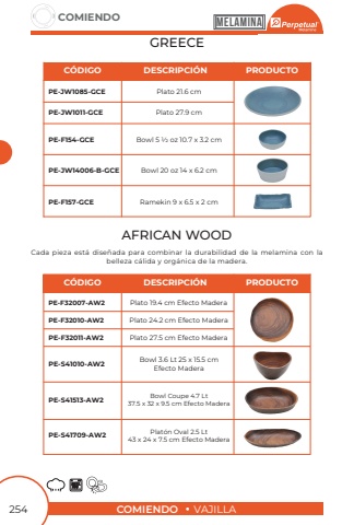 COMIENDOVAJILLACOMIENDO254GREECEPlato 27.9 cmPlato 21.6 cmBowl Coupe 4.7 Lt37.5 x 32 x 9.5 cm Efecto MaderaBowl 3.6 Lt 25 x 15.5 cmEfecto MaderaPlat%u00f3n Oval 2.5 Lt43 x 24 x 7.5 cm Efecto MaderaPE-JW1011-GCEPE-S41010-AW2PE-S41709-AW2PE-JW1085-GCEPE-S41513-AW2C%u00d3DIGODESCRIPCI%u00d3NPRODUCTOBowl 20 oz 14 x 6.2 cmRamekin 9 x 6.5 x 2 cmBowl 5 1/2 oz 10.7 x 3.2 cmPE-JW14006-B-GCEPE-F157-GCEPE-F154-GCEPlato 19.4 cm Efecto MaderaPlato 24.2 cm Efecto MaderaPlato 27.5 cm Efecto MaderaPE-F32007-AW2PE-F32010-AW2PE-F32011-AW2C%u00d3DIGODESCRIPCI%u00d3NPRODUCTOCada pieza est%u00e1 dise%u00f1ada para combinar la durabilidad de la melamina con la belleza c%u00e1lida y org%u00e1nica de la madera.AFRICAN WOODMELAMINA