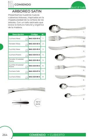 COMIENDOCUBIERTOCOMIENDO26418/10INOXPresentamos nuestros nuevos cubiertos Arboreo, inspirados en la majestuosidad de la corteza de los %u00e1rboles. Con un tallo satinado que evoca la textura natural y org%u00e1nica de la madera.ARBOREO SATINCuchara MesaTenedor MesaCuchillo MesaCuchara PostreTenedor Ensalada/ PostreCuchillo Ensalada/ PostreCuchara Caf%u00e9Cuchara MokaBAG-S23-01-SBAG-S23-02-SBAG-S23-03-SBAG-S23-04-SBAG-S23-05-SBAG-S23-06-SBAG-S23-07-SBAG-S23-08-S11234567823456781212121212121212Descripci%u00f3nC%u00f3digoN.%u00b0