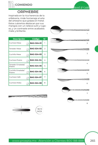 www.proepta.mxAtenci%u00f3n a Clientes 800 188 888COMIENDO26518/10INOXInspirada en la rica herencia de la orfebrer%u00eda, rinde homenaje al arte del artesano que golpea el metal. Estos cubiertos destacan por sus mangos con un relieve sutil y rugoso, y un contraste entre acabados mate y brillante.ORPHEBRECuchara MesaTenedor MesaCuchillo MesaCuchara PostreTenedor Ensalada/ PostreCuchillo Ensalada/ PostreCuchara Caf%u00e9Cuchara MokaBAG-S24-01BAG-S24-02BAG-S24-03BAG-S24-04BAG-S24-05BAG-S24-06BAG-S24-07BAG-S24-0811234567823456781212121212121212Descripci%u00f3nC%u00f3digoN.%u00b0
