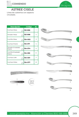 www.proepta.mxAtenci%u00f3n a Clientes 800 188 888COMIENDO269L%u00ednea de cubiertos con aspecto cincelado.ASTREE CISELE18/10INOX3.5 mmCuchara MesaTenedor MesaCuchillo MesaCuchara PostreTenedor Ensalada/PostreCuchillo Ensalada/PostreCuchara Caf%u00e9Cuchara Moka153-996153-998154-002154-571154-574154-555154-001154-57711234567823456781212121212121212Descripci%u00f3nC%u00f3digoN.%u00b0