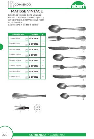 COMIENDOCUBIERTOCOMIENDO270MATISSE VINTAGE18/10INOX2.5 mmEsta l%u00ednea vintage tiene una apariencia con textura de otra %u00e9poca y un color cromo hermoso que resalta en la mesa.Es de acero inoxidable s%u00f3lido.Cuchara MesaTenedor MesaCuchillo MesaCuchara PostreTenedor PostreCuchillo PostreCuchara Caf%u00e9Cuchara MokaB-CF15101B-CF15102B-CF15105B-CF15111B-CF15112B-CF15115B-CF15121B-CF1512211234567823456781212121212121212Descripci%u00f3nC%u00f3digoN.%u00b0