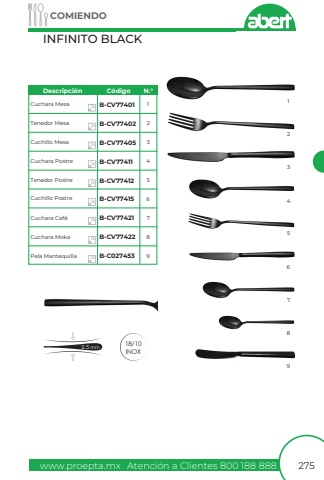www.proepta.mxAtenci%u00f3n a Clientes 800 188 888COMIENDO27518/10INOX2.5 mmINFINITO BLACKCuchara MesaTenedor MesaCuchillo MesaCuchara PostreTenedor PostreCuchillo PostreCuchara Caf%u00e9Cuchara MokaPala MantequillaB-CV77401B-CV77402B-CV77405B-CV77411B-CV77412B-CV77415B-CV77421B-CV77422B-C027453112345678923456789121212121212121212Descripci%u00f3nC%u00f3digoN.%u00b0