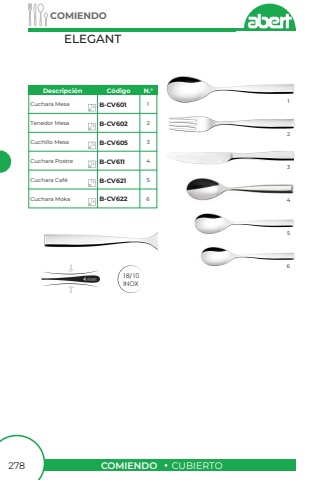 COMIENDOCUBIERTOCOMIENDO278Cuchara MesaTenedor MesaCuchillo MesaCuchara PostreCuchara Caf%u00e9Cuchara MokaB-CV601B-CV602B-CV605B-CV611B-CV621B-CV622211234563456121212121212Descripci%u00f3nC%u00f3digoN.%u00b0ELEGANT18/10INOX4 mm