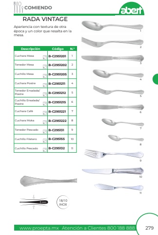 www.proepta.mxAtenci%u00f3n a Clientes 800 188 888COMIENDO279Apariencia con textura de otra %u00e9poca y un color que resalta en la mesa.RADA VINTAGE18/10INOX3 mmCuchara MesaTenedor MesaCuchillo MesaCuchara PostreTenedor Ensalada/PostreCuchillo Ensalada/PostreCuchara Caf%u00e9Cuchara MokaTenedor PescadoCuchillo FileteroCuchillo PescadoB-C2951201B-C2951202B-C2951205B-C2951211B-C2951212B-C2951215B-C2951221B-C295131B-C295155B-C295132B-C2951222112345678910112345678910111212121212121212121212Descripci%u00f3nC%u00f3digoN.%u00b0