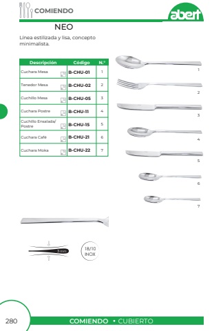 COMIENDOCUBIERTOCOMIENDO280L%u00ednea estilizada y lisa, concepto minimalista.NEO18/10INOX3 mmCuchara MesaTenedor MesaCuchillo MesaCuchara PostreCuchillo Ensalada/ PostreCuchara Caf%u00e9Cuchara MokaB-CHU-01B-CHU-02B-CHU-05B-CHU-11B-CHU-15B-CHU-21B-CHU-221123456723456712121212121212Descripci%u00f3nC%u00f3digoN.%u00b0