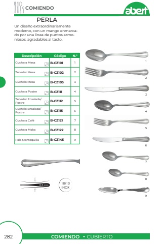 COMIENDOCUBIERTOCOMIENDO282Un dise%u00f1o extraordinariamente moderno, con un mango enmarcado por una l%u00ednea de puntos armoniosos, agradables al tacto.PERLA18/10INOX2.5 mmCuchara MesaTenedor MesaCuchillo MesaCuchara PostreTenedor Ensalada/PostreCuchillo Ensalada/PostreCuchara Caf%u00e9Cuchara MokaPala MantequillaB-CZ101B-CZ102B-CZ105B-CZ111B-CZ112B-CZ115B-CZ121B-CZ145B-CZ122112345687923456789121212121212121212Descripci%u00f3nC%u00f3digoN.%u00b0