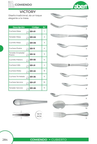 COMIENDOCUBIERTOCOMIENDO284VICTORY18/10INOX2.5 mmDise%u00f1o tradicional, da un toque elegante a la mesa.Cuchara MesaTenedor MesaCuchillo MesaCuchara PostreTenedor Ensalada/Postre331-01331-02331-05331-11331-12112345623456121212121212Descripci%u00f3nC%u00f3digoN.%u00b0Cuchillo FileteroCuchara C%u00e1feCuchara MokaCuchara T%u00e9 HeladoCuchara ServicioTenedor Servicio331-55331-21331-22331-35331-27331-26778910118910111212121212