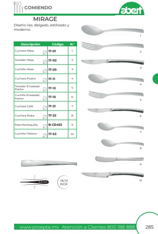www.proepta.mxAtenci%u00f3n a Clientes 800 188 888COMIENDO285Dise%u00f1o liso, delgado, estilizado y moderno.MIRAGE18/10INOX2.5 mmCuchara MesaTenedor MesaCuchillo MesaCuchara PostreTenedor Ensalada/PostreCuchillo Ensalada/PostreCuchara Caf%u00e9Cuchara MokaPala MantequillaCuchillo Filetero17-0117-0217-0517-1117-1217-1517-2117-22B-CE45317-53112345678910234567891012121212121212121212Descripci%u00f3nC%u00f3digoN.%u00b0