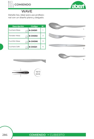 COMIENDOCUBIERTOCOMIENDO286Detalle liso, ideal para uso profesional con un dise%u00f1o plano y delgado.WAVE18/10INOX1.8 mmCuchara MesaTenedor MesaCuchillo MesaCuchara Caf%u00e9B-CHD01B-CHD02B-CHD06B-CHD211234213412121212Descripci%u00f3nC%u00f3digoN.%u00b0