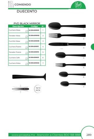 www.proepta.mxAtenci%u00f3n a Clientes 800 188 888COMIENDO289DUECENTO18/10INOXCuchara MesaTenedor MesaCuchillo MesaCuchara PostreTenedor PostreCuchara MokaCuchara Caf%u00e9B-2004200001B-2004200002B-2004200005B-2004200011B-2004200012B-2004200021B-2004200022123456712121212121212Descripci%u00f3nC%u00f3digoN.%u00b01234567PVD BLACK MIRROR5 mm
