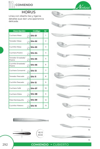 COMIENDOCUBIERTOCOMIENDO292HORUS18/10INOX3.5 mmL%u00ednea con dise%u00f1o liso y ligeros detalles que dan una apariencia delicada.Cuchara MesaTenedor MesaCuchillo MesaCuchara PostreTenedor Ensalada/PostreCuchillo Ensalada/PostreCuchara Consom%u00e9Tenedor PescadoCuchillo PescadoCuchara Caf%u00e9Cuchara MokaPala MantequillaCuchillo FileteroS14-01S14-02S14-03S14-04S14-05S14-06S14-13S14-11S14-12S14-07S14-08S14-09S14-10112345678234567891011121312121212121212121212121212Descripci%u00f3nC%u00f3digoN.%u00b0910111213