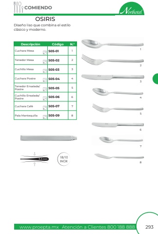 www.proepta.mxAtenci%u00f3n a Clientes 800 188 888COMIENDO293OSIRISDise%u00f1o liso que combina el estilo cl%u00e1sico y moderno.18/10INOX3.5 mmCuchara MesaTenedor MesaCuchillo MesaCuchara PostreTenedor Ensalada/PostreCuchillo Ensalada/PostreCuchara Caf%u00e9Pala MantequillaS05-01S05-02S05-03S05-04S05-05S05-06S05-07S05-09123456781212121212121212Descripci%u00f3nC%u00f3digoN.%u00b012345678