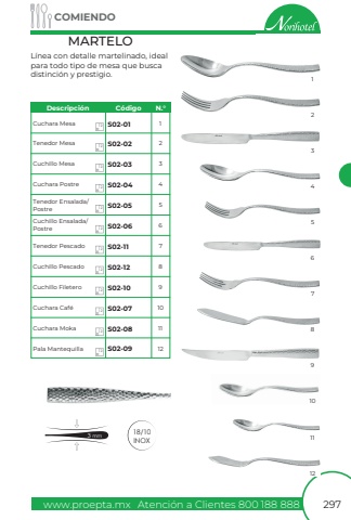 www.proepta.mxAtenci%u00f3n a Clientes 800 188 888COMIENDO297L%u00ednea con detalle martelinado, ideal para todo tipo de mesa que busca distinci%u00f3n y prestigio.MARTELO18/10INOX3 mmCuchara MesaTenedor MesaCuchillo MesaCuchara PostreTenedor Ensalada/PostreCuchillo Ensalada/PostreTenedor PescadoCuchillo PescadoCuchillo FileteroCuchara Caf%u00e9Cuchara MokaPala MantequillaS02-01S02-02S02-03S02-04S02-05S02-06S02-11S02-12S02-10S02-07S02-08S02-09112345678910111223456789101112121212121212121212121212Descripci%u00f3nC%u00f3digoN.%u00b0