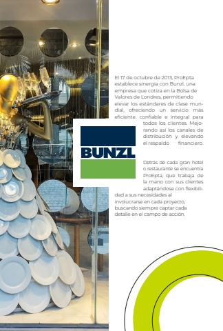 El 17 de octubre de 2013, ProEpta establece sinergia con Bunzl, una empresa que cotiza en la Bolsa de Valores de Londres, permitiendo elevar los est%u00e1ndares de clase mundial, ofreciendo un servicio m%u00e1s eficiente, confiable e integral para todos los clientes. Mejorando as%u00ed los canales de distribuci%u00f3n y elevando el respaldo financiero.Detr%u00e1s de cada gran hotel o restaurante se encuentraProEpta, que trabaja de la mano con sus clientes adapt%u00e1ndose con flexibilidad a sus necesidades al involucrarse en cada proyecto, buscando siempre captar cada detalle en el campo de acci%u00f3n.