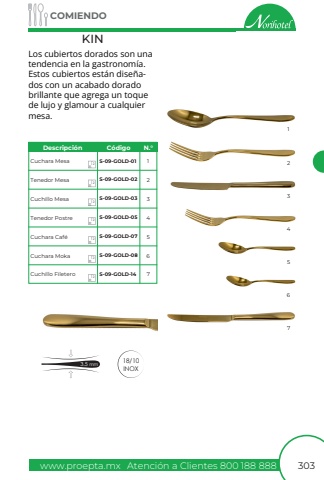 www.proepta.mxAtenci%u00f3n a Clientes 800 188 888COMIENDO303KINLos cubiertos dorados son una tendencia en la gastronom%u00eda. Estos cubiertos est%u00e1n dise%u00f1ados con un acabado dorado brillante que agrega un toque de lujo y glamour a cualquier mesa.18/10INOXCuchara MesaTenedor MesaCuchillo MesaTenedor PostreCuchara Caf%u00e9Cuchillo FileteroCuchara MokaS-09-GOLD-01S-09-GOLD-02S-09-GOLD-03S-09-GOLD-05S-09-GOLD-07S-09-GOLD-08S-09-GOLD-14123456712121212121212Descripci%u00f3nC%u00f3digoN.%u00b012345673.5 mm