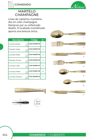 COMIENDOCUBIERTOCOMIENDO304MARTELOCHAMPAGNEL%u00ednea de cubiertos martelinados en color champagne.Destacan por su sofisticado dise%u00f1o. El acabado martelinado aporta una textura %u00fanica.18/10INOXCuchara MesaTenedor MesaCuchillo MesaTenedor PostreCuchara Caf%u00e9Cuchillo FileteroCuchara MokaS-02-CHAMP-01S-02-CHAMP-02S-02-CHAMP-03S-02-CHAMP-05S-02-CHAMP-07S-02-CHAMP-08S-02-CHAMP-10123456712121212121212Descripci%u00f3nC%u00f3digoN.%u00b012345673 mm