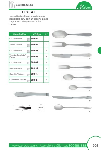 www.proepta.mxAtenci%u00f3n a Clientes 800 188 888COMIENDO305Los cubiertos l%u00edneal son de aceroinoxidable 18/0 con un dise%u00f1o plano muy adecuado para todas lasmesas.LINEALCuchara MesaTenedor MesaCuchillo MesaCuchara Caf%u00e9Cuchara MokaTenedor Ensalada/PostreCuchara T%u00e9 HeladoCuchillo FileteroS09-01S09-02S09-03S09-05S09-07S09-08S09-14S09-15123456781212121212121212Descripci%u00f3nC%u00f3digoN.%u00b03.5 mmINOX12345678