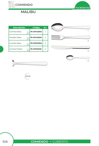 COMIENDOCUBIERTOCOMIENDO306MALIBUCuchara MesaTenedor MesaCuchillo MesaCuchara PostreTR-23743/500TR-23742/500TR-23731/504TR-23736/500213412121212Descripci%u00f3nC%u00f3digoN.%u00b01234INOX