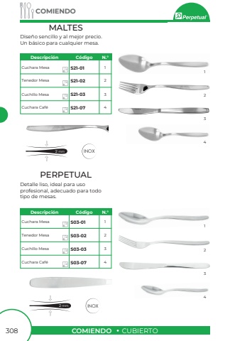 COMIENDOCUBIERTOCOMIENDO308Cuchara MesaTenedor MesaCuchillo MesaCuchara Caf%u00e9S21-01S21-02S21-03S21-07213412121212Descripci%u00f3nC%u00f3digoN.%u00b0MALTESDise%u00f1o sencillo y al mejor precio.Un b%u00e1sico para cualquier mesa.12342 mmINOXCuchara MesaTenedor MesaCuchillo MesaCuchara Caf%u00e9S03-01S03-02S03-03S03-07213412121212Descripci%u00f3nC%u00f3digoN.%u00b0PERPETUALDetalle liso, ideal para uso profesional, adecuado para todo tipo de mesas.2 mmINOX1234