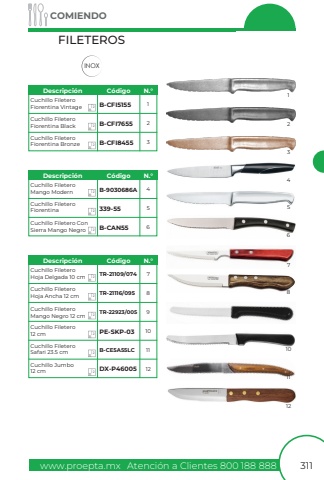 www.proepta.mxAtenci%u00f3n a Clientes 800 188 888COMIENDO311FILETEROSINOXCuchillo Filetero Fiorentina VintageCuchillo Filetero Mango ModernCuchillo Filetero Hoja Delgada 10 cmCuchillo Filetero FiorentinaCuchillo Filetero Hoja Ancha 12 cmCuchillo Filetero Fiorentina BlackCuchillo Filetero Fiorentina BronzeCuchillo Filetero Con Sierra Mango NegroCuchillo Filetero12 cmCuchillo FileteroSafari 23.5 cmCuchillo Jumbo12 cmB-CFI5155B-9030686ATR-21109/074339-55TR-21116/095B-CFI7655B-CFI8455B-CAN55PE-SKP-03B-CE5A55LCDX-P46005112345678910111247582369101112121212121212121212121212Descripci%u00f3nDescripci%u00f3nDescripci%u00f3nC%u00f3digoC%u00f3digoC%u00f3digoN.%u00b0N.%u00b0N.%u00b0Cuchillo FileteroMango Negro 12 cmTR-22923/005