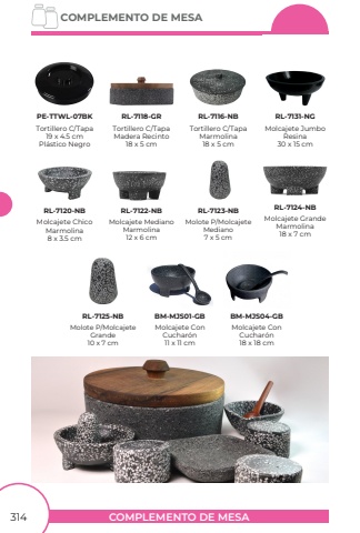 COMPLEMENTO DE MESACOMPLEMENTO DE MESA314Tortillero C/Tapa19 x 4.5 cmPl%u00e1stico NegroMolcajete ChicoMarmolina8 x 3.5 cmMolote P/MolcajeteGrande 10 x 7 cmMolcajete JumboResina30 x 15 cmMolcajete GrandeMarmolina18 x 7 cmTortillero C/TapaMarmolina18 x 5 cmMolote P/MolcajeteMediano7 x 5 cmMolcajete ConCuchar%u00f3n18 x 18 cmTortillero C/TapaMadera Recinto18 x 5 cmMolcajete MedianoMarmolina12 x 6 cmMolcajete ConCuchar%u00f3n11 x 11 cmPE-TTWL-07BKRL-7120-NBRL-7125-NBRL-7131-NGRL-7124-NBRL-7116-NBRL-7123-NBBM-MJS04-GBRL-7118-GRRL-7122-NBBM-MJS01-GB