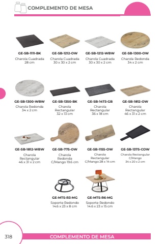 COMPLEMENTO DE MESACOMPLEMENTO DE MESA318Charola Cuadrada30 x 30 x 2 cmCharola Cuadrada28 cmCharola Cuadrada30 x 30 x 2 cmGE-SB-1111-BKGE-SB-1212-OWGE-SB-1212-WBWCharola Redonda34 x 2 cmGE-SB-1300-OWCharola Redonda34 x 2 cmCharola RectangularC/Mango 28 x 14 cmCharolaRedondaC/Mango 19.6 cmCharola Rectangular C/Mango34 x 20 x 2 cmGE-SB-1300-WBWGE-SB-775-OWGE-SB-1155-OWGE-SB-1375-COWCharolaRectangular36 x 18 cmCharolaRectangular46 x 31 x 2 cmCharolaRectangular32 x 13 cmCharolaRectangular46 x 31 x 2 cmGE-SB-1350-BKGE-SB-1473-GBGE-SB-1812-OWGE-SB-1812-WBWSoporte Redondo14.6 x 23 x 8 cmSoporte Redondo14.6 x 23 x 15 cmGE-MTS-R3-MGGE-MTS-R6-MG