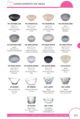 www.proepta.mxAtenci%u00f3n a Clientes 800 188 888COMPLEMENTO DE MESA323Bowl 1 Lt19 x 6.3 cmMelamina NegraLinesPE-JW16189-LNSBowl 4 3/4 oz10 x 3.5 cmMelamina BeigeLinesBowl 1 Lt19 x 6.3 cmMelamina BeigeLinesBowl12.8 x 4.7 cmMelaminaBubblesPE-JW16100-BLPE-JW16189-BLPE-JW14005-BBSBowl18 x 5.3 cmMelamina BubblesBowl 30 oz19.2 x 5.5 cmMelamina ArenaInt. Blanco MichelinBowl 30 oz19.2 x 5.5 cmMelamina GrisMichelinBowl 17 oz14 x 6 cmMelamina BlancoRibsBowl 17 oz14 x 6 cmMelamina NegroRibsBowl 6 3/4 oz11.9 x 5.5 cmMelamina ArenaInt. Blanco MichelinBowl 6 3/4 oz11.9 x 5.5 cmMelamina GrisMichelinPE-JW14007-BBSPE-31552-MHSWPE-31552-MHGRPE-A01015-RBWHPE-A01015-RBBKPE-31551-MHSWPE-31551-MHGRBowlMelamina16 ozGE-B-525-DIBowl Multiusos6 3/4 oz13 cmBowl Multiusos6 3/4 oz99-23568399-235682BowlMaeva Diamant11 3/4 oz 12 cmARC-L6690BowlMaeva Vintage11 3/4 oz 12 cmARC-L6692Bowl Mini3 1/4 oz 7 x 3.5 cmDeliceMini BowlTempladoEmpilable 1 ozLR-642301ARC-V7515