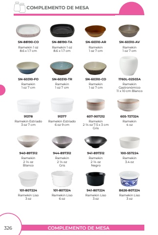 COMPLEMENTO DE MESACOMPLEMENTO DE MESA326Ramekin1 oz 7 cmSN-60310-ARRamekin1 oz 7 cmSN-60310-AVRamekin1 oz 7 cmSN-60310-FORamekin1 oz 7 cmRamekin1 oz 7 cmSN-60310-TRSN-60310-CORamekin 1 oz8.6 x 1.7 cmSN-88190-CORamekin 1 oz8.6 x 1.7 cmSN-88190-TARamekinGastron%u00f3mico11 x 10 cm Blanco1760L-02503ARamekin Estriado3 oz 7 cm91378Ramekin Estriado6 oz 9 cm91377Ramekin2 2/5 oz 7.5 x 3 cmGris607-907212Ramekin4 oz605-727324Ramekin2 2/5 ozBlancoRamekin2 2/5 ozGrisRamekin2 2/5 ozNegro940-897312944-897312941-897312Ramekin Liso6 oz101-807324Ramekin Liso3 oz101-807224Ramekin Liso3 oz941-807224Ramekin3.4 oz100-557224Ramekin Liso3 ozB626-807224