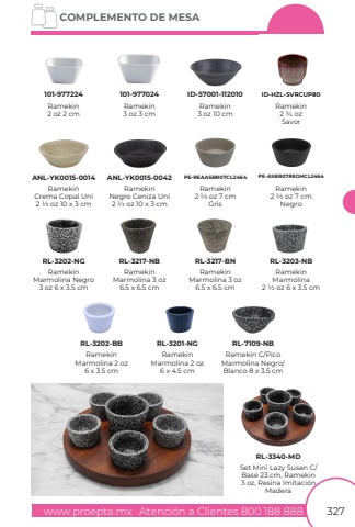 www.proepta.mxAtenci%u00f3n a Clientes 800 188 888COMPLEMENTO DE MESA327Ramekin2 oz 2 cm101-977224Ramekin3 oz 3 cm101-977024Ramekin3 oz 10 cmRamekinCrema Copal Uni2 1/3 oz 10 x 3 cmRamekin2 3/4 ozSavorRamekinNegro Ceniza Uni2 1/3 oz 10 x 3 cmID-57001-112010ANL-YK0015-0014ID-HZL-SVRCUP80ANL-YK0015-0042RamekinMarmolina 3 oz6.5 x 6.5 cmRamekinMarmolina Negro3 oz 6 x 3.5 cmRL-3202-NGRL-3217-NBRamekinMarmolina2 1/2 oz 6 x 3.5 cmRamekinMarmolina 3 oz6.5 x 6.5 cmRL-3217-BNRL-3203-NBSet Mini Lazy Susan C/Base 23 cm, Ramekin3 oz, Resina Imitaci%u00f3n MaderaRL-3340-MDRamekinMarmolina 2 oz6 x 3.5 cmRL-3202-BBRamekinMarmolina 2 oz6 x 4.5 cmRL-3201-NGRamekin C/PicoMarmolina Negro/Blanco 8 x 3.5 cmRL-7109-NBRamekin2 2/3 oz 7 cmGrisRamekin2 2/3 oz 7 cmNegroPE-REAASBR07CL2464PE-ASBR07REGMCL2464