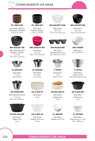 COMPLEMENTO DE MESACOMPLEMENTO DE MESA328Ramekin3 1/3 oz7.5 x 7.5 x 4.5 cmBM-MAD07-WWRamekin3 1/3 oz7.5 x 7.5 x 4.5 cmRamekin Resina Negro Granito3 1/3 oz7.5 x 7.5 x 4.5 cmRamekin3 1/3 oz7.5 x 7.5 x 4.5 cmBM-MAD07-BBBM-MAD07-GBBM-MAD07-RMSet De 3Ramekines 2 oz C/U 18 x 6 x 4 cmBM-BS403-BBRamekin3 oz6.5 x 4 cmV-46713Ramekin2 1/2 oz4 x 6 cmRamekin Acero Inox.4 oz 7.6 Dia x 4 cmCL-602500V-46714Ramekin1 1/2 oz2.5 x 6 cmCL-602400Ramekin/Flanero5 3/4 oz8.2 x 5 x 4.8 cmPE-SMSB-055Ramekin Resina Imitaci%u00f3n Madera 4 oz 7 x 5 cmRamekinResina Negro4 oz 7 x 5 cmRL-3360-MDRL-3360-NGRamekin6 1/4 oz 9 cmARC-N9397Ramekin4 ozGE-S-640-IVRamekinMelamina2 ozRamekinMelamina2 ozGE-RM-200-IVGE-S-620-BKRamekinMelamina4 ozGE-RM-400-BKRamekinMelamina 2 ozRamekinMelamina 2 oz7 cmGE-S-620-WCL-S85202RamekinMelamina 1 1/2 oz6.3 x 3.8 cmCL-S27502