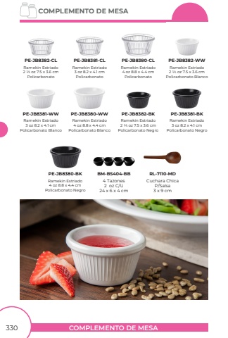 COMPLEMENTO DE MESACOMPLEMENTO DE MESA330Ramekin Estriado3 oz 8.2 x 4.1 cmPolicarbonato BlancoRamekin Estriado4 oz 8.8 x 4.4 cmPolicarbonato BlancoPE-JB8381-WWPE-JB8380-WWRamekin Estriado2 1/5 oz 7.5 x 3.6 cmPolicarbonato NegroRamekin Estriado3 oz 8.2 x 4.1 cmPolicarbonato NegroPE-JB8382-BKPE-JB8381-BKRamekin Estriado4 oz 8.8 x 4.4 cmPolicarbonato NegroPE-JB8380-BKRamekin Estriado2 1/5 oz 7.5 x 3.6 cmPolicarbonato BlancoPE-JB8382-WWRamekin Estriado2 1/5 oz 7.5 x 3.6 cmPolicarbonatoRamekin Estriado3 oz 8.2 x 4.1 cmPolicarbonatoRamekin Estriado4 oz 8.8 x 4.4 cmPolicarbonatoPE-JB8382-CLPE-JB8381-CLPE-JB8380-CL4 Tazones2 oz C/U24 x 6 x 4 cmBM-BS404-BBCuchara ChicaP/Salsa3 x 9 cmRL-7110-MD