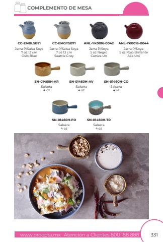 www.proepta.mxAtenci%u00f3n a Clientes 800 188 888COMPLEMENTO DE MESA331Salsera4 ozSalsera4 ozSalsera4 ozSalsera4 ozSalsera4 ozSN-01460H-AVSN-01460H-COSN-01460H-TRSN-01460H-ARSN-01460H-FOJarra P/Salsa Soya7 oz 13 cmOslo BlueJarra P/Salsa Soya7 oz 13 cmSeattle GreyJarra P/Soya5 oz NegroCeniza UnJarra P/Soya5 oz Rojo BrillanteAka UniCC-EMBLSB71CC-EMGYSB71ANL-YK0016-0042ANL-YK0016-0044