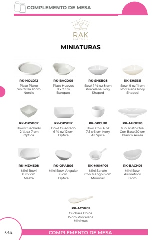 COMPLEMENTO DE MESACOMPLEMENTO DE MESA334Plato PlanoSin Orilla 12 cmNordicBowl Cuadrado 2 1/4 oz 7 cmOpticaMini Bowl Angular6 cmOpticaMini Sart%u00e9nCon Mango 6 cmMinimaxMini BowlAsim%u00e9trico8 cmMini Bowl8 x 7 cmMazzaCuchara China15 cm PorcelanaMinimaxBowl 1 1/2 oz 8 cmPorcelana IvoryShapedBowl 9 oz 11 cmPorcelana IvoryShapedPlato Huevos9 x 7 cmBanquetBowl Cuadrado6 3/4 oz 12 cmOpticaBowl Chili 6 oz7.5 x 6 cm IvoryAll SpiceMini Plato OvalCon Base 20 cmBlanco AureaRK-NOLD12RK-OPSB07RK-MZMS08RK-OPAB06RK-MNMP01RK-BACH01RK-ACSP01RK-BACD09RK-SHSB08RK-SHSB11RK-OPSB12RK-SPCU18RK-AUOB20MINIATURAS