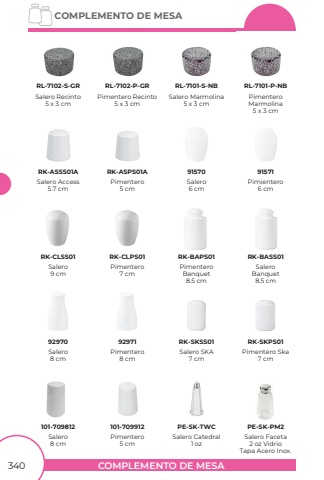 COMPLEMENTO DE MESACOMPLEMENTO DE MESA340Salero Recinto5 x 3 cmSalero Marmolina5 x 3 cmPimentero Recinto5 x 3 cmRL-7102-S-GRRL-7102-P-GRRL-7101-S-NBSalero8 cmPimentero5 cm101-709812101-709912Salero6 cmPimenteroBanquet8.5 cmSalero Access5.7 cmSalero9 cmSalero8 cmPimentero5 cmPimentero7 cmPimentero8 cmSalero SKA7 cmPimentero Ska7 cmPimientero6 cmSaleroBanquet8.5 cm91570RK-BAPS01RK-ASSS01ARK-CLSS0192970RK-ASPS01ARK-CLPS0192971RK-SKSS01RK-SKPS0191571RK-BASS01Salero Catedral1 ozPE-SK-TWCPimenteroMarmolina5 x 3 cmRL-7101-P-NBSalero Faceta2 oz VidrioTapa Acero Inox.PE-SK-PM2