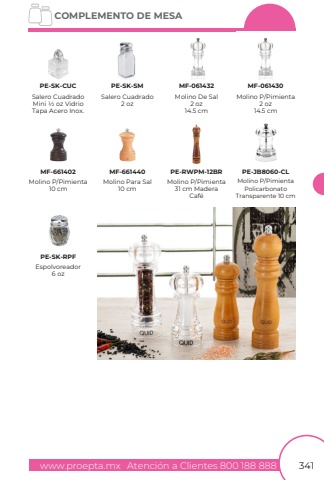 www.proepta.mxAtenci%u00f3n a Clientes 800 188 888COMPLEMENTO DE MESA341Molino De Sal2 oz14.5 cmSalero Cuadrado2 ozMolino P/Pimienta2 oz14.5 cmEspolvoreador6 ozMolino Para Sal10 cmMolino P/Pimienta10 cmPE-SK-SMMF-061432MF-061430PE-SK-RPFMF-661402MF-661440Molino P/Pimienta31 cm MaderaCaf%u00e9Molino P/PimientaPolicarbonatoTransparente 10 cmPE-RWPM-12BRPE-JB8060-CLSalero CuadradoMini 1/2 oz VidrioTapa Acero Inox.PE-SK-CUC