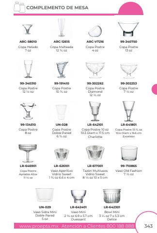 www.proepta.mxAtenci%u00f3n a Clientes 800 188 888COMPLEMENTO DE MESA343Copa Helado7 ozCopa Postre12 1/2 ozCopa Postre8 ozCopa Postre4 ozCopa PostreDiamond12 1/4 ozVaso Old Fashion7 1/2 ozCopa Postre13 ozCopa Postre7 1/2 ozCopa Malteada12 3/4 ozCopa Postre10 3/4 ozCopa PostreDoble Pared6 3/4 ozVaso AperitivoVidrio Sweet1 3/4 oz 6.6 x 4 cmTaz%u00f3n MultiusosVidrio Sweet8 1/2 oz 10 x 5 cmARC-5801099-34031099-134510ARC-V721699-30226299-71086599-34075099-302253ARC-1261599-191410UN-028LR-626101LR-617001Vaso Sidra MiniDoble Pared5 ozUN-029Copa Postre 10 oz10.3 Diam x 17.5 cmCharlotteCopa PostreApilable Alice11 1/6 ozCopa Postre 13 3/4 oz10.4 Diam x 16.6 cmExcelsiorLR-642101LR-646901LR-641801Vaso Mini2 4/5 oz 6.9 x 5.7 cmOuessantBowl Mini3 1/4 oz 7 x 5.3 cmDeliceLR-642401LR-642301