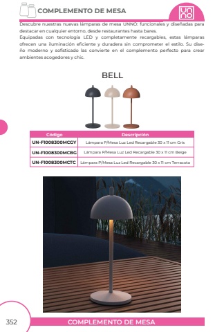 COMPLEMENTO DE MESACOMPLEMENTO DE MESA352UN-F1008300MCGYUN-F1008300MCBGUN-F1008300MCTCL%u00e1mpara P/Mesa Luz Led Recargable 30 x 11 cm GrisL%u00e1mpara P/Mesa Luz Led Recargable 30 x 11 cm BeigeL%u00e1mpara P/Mesa Luz Led Recargable 30 x 11 cm TerracotaC%u00f3digoDescripci%u00f3nDescubre nuestras nuevas l%u00e1mparas de mesa UNNO: funcionales y dise%u00f1adas para destacar en cualquier entorno, desde restaurantes hasta bares.Equipadas con tecnolog%u00eda LED y completamente recargables, estas l%u00e1mparas ofrecen una iluminaci%u00f3n eficiente y duradera sin comprometer el estilo. Su dise%u00f1o moderno y sofisticado las convierte en el complemento perfecto para crearambientes acogedores y chic.BELL