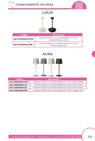 www.proepta.mxAtenci%u00f3n a Clientes 800 188 888COMPLEMENTO DE MESA355UN-F1734S140CCCWUN-C2160290CCWHUN-F1734S140CCBKUN-C2160290CCGYUN-C2160290CCSCUN-C2160290CCBKL%u00e1mpara P/Mesa Luz Led Recargable 14 x 7.5 cmCer%u00e1mica Blanco CremaL%u00e1mpara P/Mesa Luz Led Recargable 29 x 10.9 cm Blanco MateL%u00e1mpara P/Mesa Luz Led Recargable 14 x 7.5 cmCer%u00e1mica Negro JetL%u00e1mpara P/Mesa Luz Led Recargable 29 x 10.9 cm Gris MateL%u00e1mpara P/Mesa Luz Led Recargable 29 x 10.9 cm Arena MateL%u00e1mpara P/Mesa Luz Led Recargable 29 x 10.9 cm Negro MateC%u00f3digoC%u00f3digoDescripci%u00f3nDescripci%u00f3nLOUISAURA