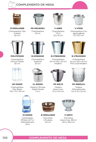 COMPLEMENTO DE MESACOMPLEMENTO DE MESA358Champa%u00f1eraImperial20 cmChampa%u00f1eraC%u00f3nica C/Asas20 cmChampa%u00f1era24 cm Dia x 22 cmModernChampa%u00f1era24 cm Dia x 22 cmPVD Gold ModernPoncheraAcero Inox. 18.9 Lt 43.2 x 29.2 cmChampa%u00f1era TipoCubeta20 cmHielera C/PinzasDoble Pared1.4 LtHieleraAcero Inox.1.5 Lt 14.5 cmHieleraPolicarbonato5.2 Lt 21 x 22 cmPoncheraC/Cubeta40 cmContenedorP/Hielo 22.7 LtPolicarbonatoAzulChampa%u00f1era7.6 Lt22 x 15 cmChampa%u00f1era ConAgarraderas21 x 19.7 cmChampa%u00f1eraTipo Bolsa13.5 x 10 x 30 cmChampa%u00f1era22 cmPJN-P976200B-010520020B-V780520002B-V784120002V-46072B-3055443628CL-609190PE-WB-15PE-JB8334CLSJ-SI6000B-3055443629V-46801V-47620MF-020291PE-WB-80304
