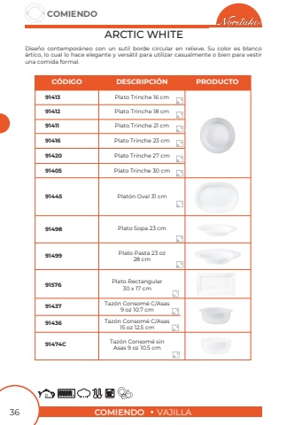 COMIENDOVAJILLACOMIENDO36ARCTIC WHITE Plato Trinche 18 cmPlato Trinche 23 cmPlato Trinche 27 cmPlat%u00f3n Oval 31 cmPlato Trinche 30 cmPlato Sopa 23 cmPlato Pasta 23 oz 28 cmPlato Trinche 16 cmPlato Trinche 21 cm914129141691420914459140591498914999141391411C%u00d3DIGODESCRIPCI%u00d3NPRODUCTODise%u00f1o contempor%u00e1neo con un sutil borde circular en relieve. Su color es blanco%u00e1rtico, lo cual lo hace elegante y vers%u00e1til para utilizar casualmente o bien para vestir una comida formal.Plato Rectangular30 x 17 cmTaz%u00f3n Consom%u00e9 C/Asas 9 oz 10.7 cmTaz%u00f3n Consom%u00e9 C/Asas 15 oz 12.5 cmTaz%u00f3n Consom%u00e9 sin Asas 9 oz 10.5 cm91576914379143691474C