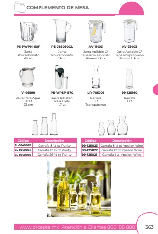 www.proepta.mxAtenci%u00f3n a Clientes 800 188 888COMPLEMENTO DE MESA363JarraPolicarbonato60 ozJarraPolicarbonato1.8 LtJarra Apilable C/Tapa PolicarbonatoBlanco 1 .8 LtJarra Apilable C/Tapa PolipropilenoBlanco 1 .8 LtPE-PWPN-60PPE-JBS090CLAV-11403AV-31403Jarra Para Agua1.8 Lt23 cmJarra C/RetenPara Hielo1.7 LtV-46599PE-WPSP-57GSL-504006299-125023SL-504006499-125022SL-504005999-125021Garrafa 8 1/2 oz PurityGarrafa 8 1/2 oz Ypsilon WineGarrafa 17 1/2 oz PurityGarrafa 17 oz Ypsilon WineGarrafa 26 1/2 oz PurityGarrafa 1 Lt Ypsilon WineC%u00f3digoDescripci%u00f3nC%u00f3digoDescripci%u00f3nGarrafa1 LtTransparenteLR-705001Garrafa1 Lt99-125160