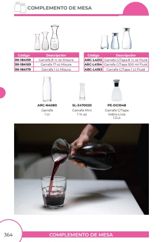 COMPLEMENTO DE MESACOMPLEMENTO DE MESA36499-184159ARC-L421299-184169ARC-L419499-184179ARC-L4193Garrafa 8 1/2 oz MisuraGarrafa C/Tapa 8 1/4 oz FluidGarrafa 17 oz MisuraGarrafa C/Tapa 500 ml FluidGarrafa 1 Lt MisuraGarrafa C/Tapa 1 Lt FluidC%u00f3digoDescripci%u00f3nC%u00f3digoDescripci%u00f3nGarrafa1 LtARC-N4080Garrafa Mini1 3/5 ozSL-3470020Garrafa C/TapaVidrio Livia1.3 LtPE-DG1048