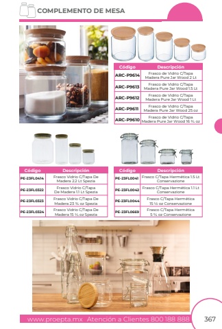 www.proepta.mxAtenci%u00f3n a Clientes 800 188 888COMPLEMENTO DE MESA367PE-23FL0414ARC-P9614PE-23FL0041PE-23FL0322ARC-P9613PE-23FL0042PE-23FL0323ARC-P9612PE-23FL0044PE-23FL0324ARC-P9611ARC-P9610PE-23FL0669Frasco Vidrio C/Tapa DeMadera 2.2 Lt SpeziaFrasco de Vidrio C/TapaMadera Pure Jar Wood 2 LtFrasco C/Tapa Herm%u00e9tica 1.5 LtConservazioneFrasco Vidrio C/TapaDe Madera 1.1 Lt SpeziaFrasco de Vidrio C/TapaMadera Pure Jar Wood 1.5 LtFrasco C/Tapa Herm%u00e9tica 1.1 LtConservazioneFrasco Vidrio C/Tapa DeMadera 23 3/4 oz SpeziaFrasco de Vidrio C/TapaMadera Pure Jar Wood 1 LtFrasco C/Tapa Herm%u00e9tica15 1/2 oz ConservazioneFrasco Vidrio C/Tapa DeMadera 15 1/4 oz SpeziaFrasco de Vidrio C/TapaMadera Pure Jar Wood 25 ozFrasco de Vidrio C/TapaMadera Pure Jar Wood 16 3/4 ozFrasco C/Tapa Herm%u00e9tica5 3/4 oz ConservazioneC%u00f3digoC%u00f3digoDescripci%u00f3nC%u00f3digoDescripci%u00f3nDescripci%u00f3n