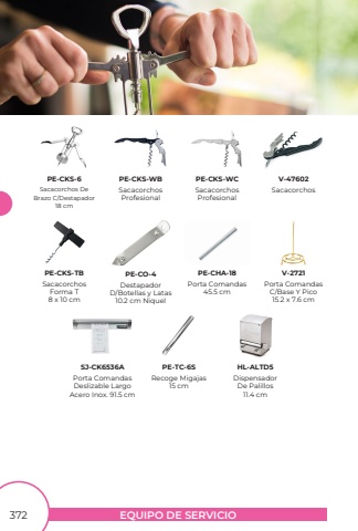 EQUIPO DE SERVICIOEQUIPO DE SERVICIO372SacacorchosProfesionalSacacorchosForma T8 x 10 cmDispensadorDe Palillos11.4 cmSacacorchosProfesionalPorta ComandasC/Base Y Pico15.2 x 7.6 cmSacacorchosRecoge Migajas15 cmSacacorchos DeBrazo C/Destapador18 cmPorta ComandasDeslizable LargoAcero Inox. 91.5 cmPorta Comandas45.5 cmPE-CKS-WCPE-CKS-TBHL-ALTD5PE-CKS-WBV-2721V-47602PE-TC-6SPE-CKS-6SJ-CK6536APE-CHA-18DestapadorD/Botellas y Latas10.2 cm NiquelPE-CO-4