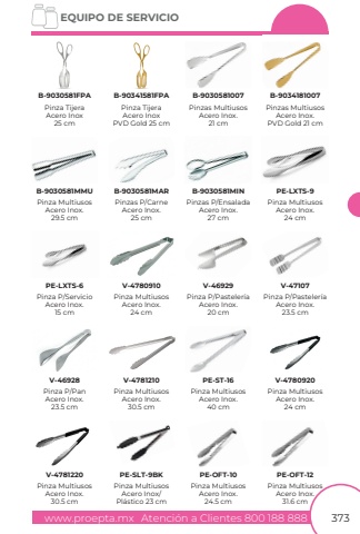 www.proepta.mxAtenci%u00f3n a Clientes 800 188 888EQUIPO DE SERVICIO373Pinza TijeraAcero Inox25 cmPinza TijeraAcero InoxPVD Gold 25 cmB-9030581FPAB-90341581FPAPinzas MultiusosAcero Inox.21 cmPinzas MultiusosAcero Inox.PVD Gold 21 cmB-9030581007B-9034181007Pinzas P/CarneAcero Inox.25 cmPinza MultiusosAcero Inox.29.5 cmB-9030581MMUB-9030581MARPinzas P/EnsaladaAcero Inox.27 cmB-9030581MINPinza MultiusosAcero Inox.24 cmPE-LXTS-9Pinza P/Pasteler%u00edaAcero Inox.20 cmPinza MultiusosAcero Inox.24 cmV-4780910V-46929Pinza P/ServicioAcero Inox.15 cmPE-LXTS-6Pinza P/Pasteler%u00edaAcero Inox.23.5 cmV-47107Pinza P/PanAcero Inox.23.5 cmV-46928Pinza MultiusosAcero Inox.30.5 cmV-4781210Pinza MultiusosAcero Inox.40 cmPE-ST-16Pinza MultiusosAcero Inox.24 cmV-4780920Pinza MultiusosAcero Inox.30.5 cmV-4781220Pinza MultiusosAcero Inox/Pl%u00e1stico 23 cmPE-SLT-9BKPinza MultiusosAcero Inox.24.5 cmPE-OFT-10Pinza MultiusosAcero Inox.31.6 cmPE-OFT-12